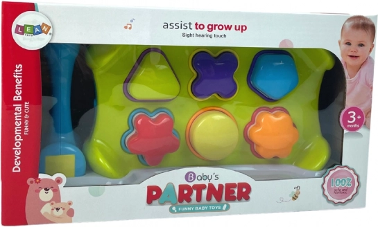 This double-sided sorter is designed for joyful learning through play. Children insert various geometric shapes into the matching openings and can tap them through to the other side using the handy hammer. The colorful design stimulates vision and invites further exploration.