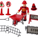 The set includes a figure in a red uniform, traffic signs, a wheelbarrow, and barriers. Perfect for construction or road safety role-play.