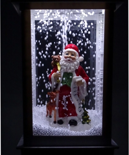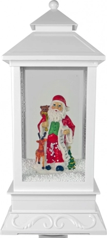 This elegant white lantern is made for Christmas décor. Inside stands a cheerful SANTA with a sack of gifts and a long wish list. An integrated pump circulates the snow from the base upward so it’s constantly “snowing” inside, creating an enchanting winter scene. The sturdy plastic body keeps it light and durable—use it year after year.