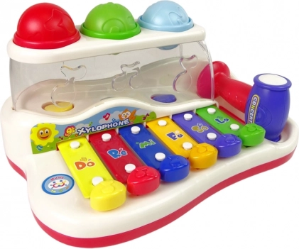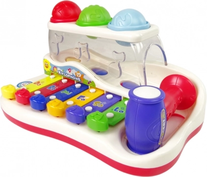 This colorful children’s xylophone combines a musical toy with a fun ball track. The brightly colored keys produce pleasant tones when tapped, helping kids playfully learn to distinguish sounds, rhythm, and simple melodies. The colorful balls can be tapped in with the hammer and watched as they travel along their path, exiting from the side of the toy — motivating further play and training hand–eye coordination.
