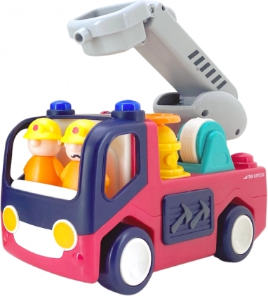 The interactive fire truck toy is ideal for developing your child's fine motor skills. It includes movable parts and various functions that enhance manual dexterity. In the front cabin sit two firefighter figures, and the trailer has elements for a small rescue operation.