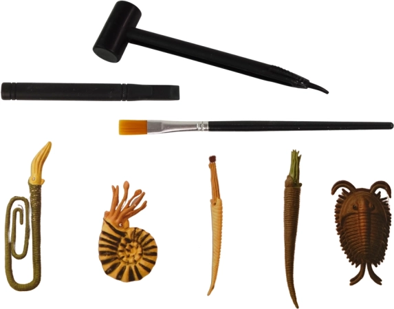 - 1 ancient creature (random species), chisel, brush, hammer, plaster, dinosaur-shaped sponge