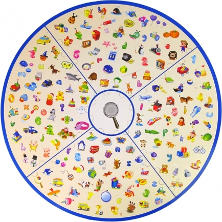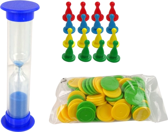 A player places their card in the middle of the play area so everyone can see what’s on it. They flip the sand timer to start the round. The player must find the images from the card on the game board as quickly as possible and mark them with their pawns. The round ends when time runs out or all images are found. For each image, they receive one token. Now it’s the next person’s turn.