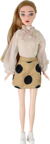 Emily has long, easy-to-comb hair, a modern outfit with a polka-dot skirt, and glasses that complete her unique style.