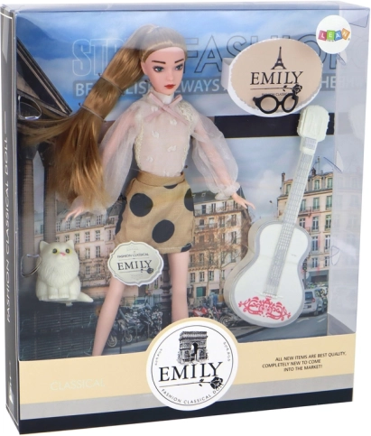 The Emily doll charms with an elegant look: a sheer white blouse with details, a brown skirt with black polka dots, and white sneakers. Her long blonde hair is tied in a ponytail and complemented by black glasses. The white guitar with pink decoration invites creative play and storytelling with a loyal kitten by her side.