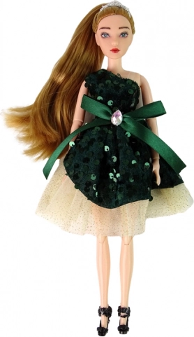 Bring a touch of magic to playtime with Emily – an elegant doll with long blonde hair, a gold tiara, and a dress with green sequins. Movable limbs allow natural posing and easy staging of fashion shows and stories.