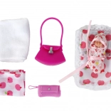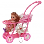The set includes a pink baby stroller with a small plush toy dog, which is a perfect accessory for walks and replaying scenarios. The small doll is ideal for playing scenarios of parental care or friendship. Also included is a baby wrapped in a blanket, which deepens children's imagination where they can develop empathy and care.