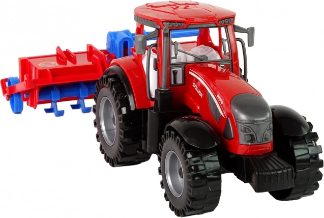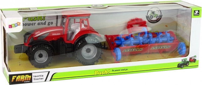 Red tractor with plough and friction drive. Movable plough, durable plastic, CE/EN71 certification. Great play and learning for children aged 3+.