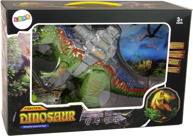 Discover an awesome action toy for little prehistoric fans. This green dinosaur is made of durable plastic, can move, lights up on the head and tail, and emits realistic sounds from its mouth. On its back, it has a magazine with a catapult that automatically releases balls roughly every 10 seconds—ideal for dynamic play scenarios.