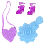The set includes pink heels, a heart-shaped handbag, and a round blue accessory — all coordinated with the doll’s outfit to expand play possibilities.
