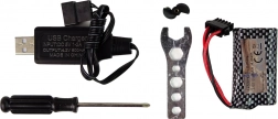 The set also includes accessories such as a battery cable, a wrench, a screwdriver, a stand to keep the motor boat stable on land, and a propeller.