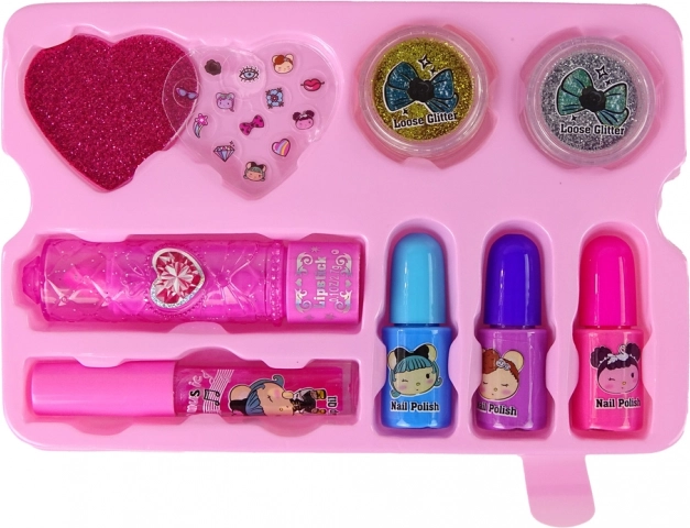 Three nail polishes in blue, purple, and pink let you experiment with different shades and create trendy nail designs. A pink lipstick and a pink tube lip gloss add a lovely tint to the lips.