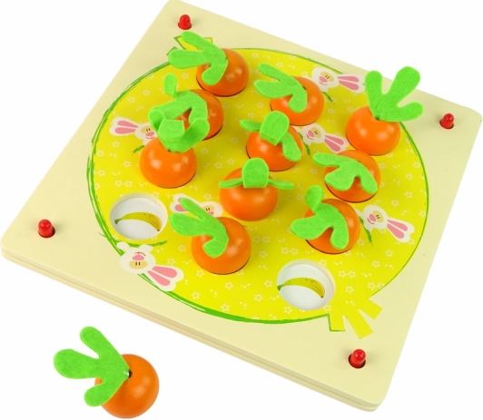 This quality wooden game supports concentration and trains memory in a playful way. Children insert cute fruit and vegetable pieces into the correct openings according to the chosen template and look for matching pairs. Robust construction ensures long-lasting durability and safe play.