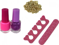 Two nail polishes in vibrant colors, a toe separator and a nail file create a mini salon for little fashion lovers. Easy and fun nail decorating anytime.