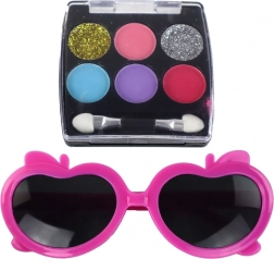 - 2× lipstick (red), eyeshadow palette (pink, purple, blue, glitter silver and gold), 2× contouring palette, kids’ pink heart-shaped glasses, makeup brushes, toe separator, nail file, 2× nail polish, plastic donut case with chain