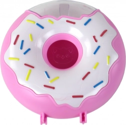 A stylish donut-shaped plastic case holds all the favorite beauty treasures and, thanks to the chain, is easy to carry on trips or to the playground.