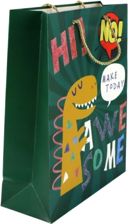 Stylish dark green paper gift bag with a cheerful dinosaur motif and subtle glitter. Thanks to sturdy gold cord handles, it is practical, durable, and perfect for birthdays, kids’ parties, and holidays.