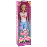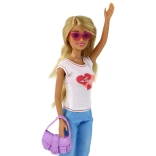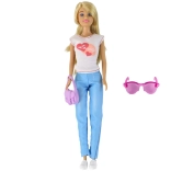 The doll wears a white T‑shirt with a heart/lips motif, blue pants, and white sneakers. The purple handbag and pink sunglasses let kids create various stylish combinations for any occasion.