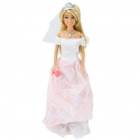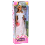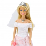 Introducing a beautiful wedding doll that will brighten any child's playtime. Dressed in a long white gown with light pink details, she brings elegance and charm. The doll holds a bouquet that perfectly matches her sophisticated look.
