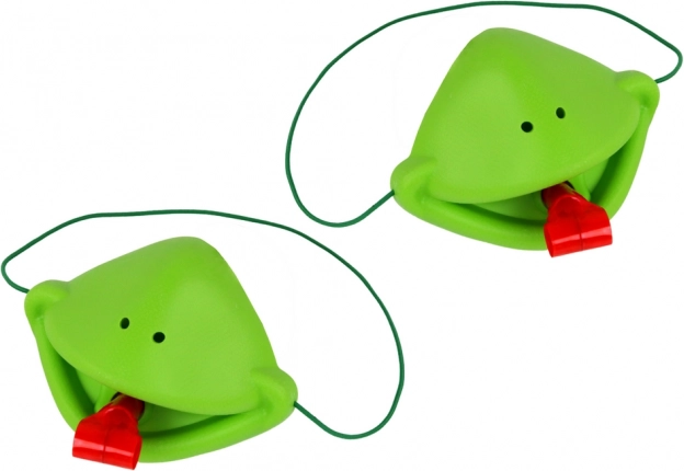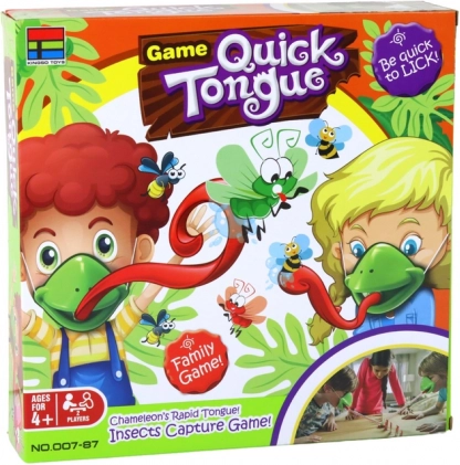 Players wearing masks sit facing each other. A row of green worms is placed on the table, each assigned a number for easier use. The dealer shuffles the red cards and places one on the table. The players’ task is to knock down the drawn worm as fast as possible. The red card goes to whoever first spots the insect card and hits it with their tongue. The winner is the player with the most cards at the end.