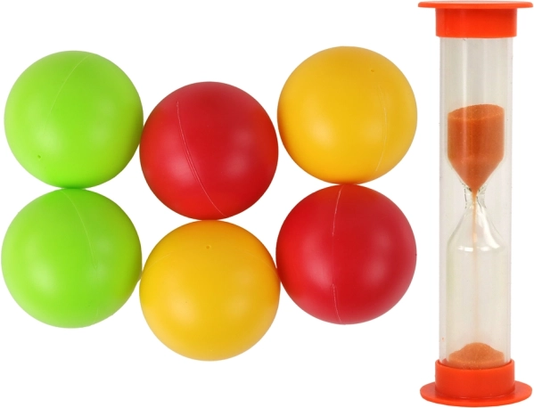 A set of balls in three colors for multiple players and a sand timer for timed rounds add pace and excitement to the game.