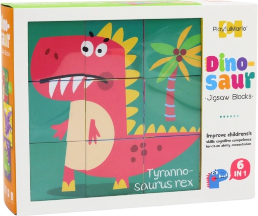 Discover a fun path to learning with the 6-in-1 cubes: each side creates a different dinosaur picture. Children practice assembling, colors, and the names of prehistoric creatures, which are shown right on the illustrations. Thanks to 9 cubes measuring 6 × 6 × 6 cm, assembly is clear and safe.