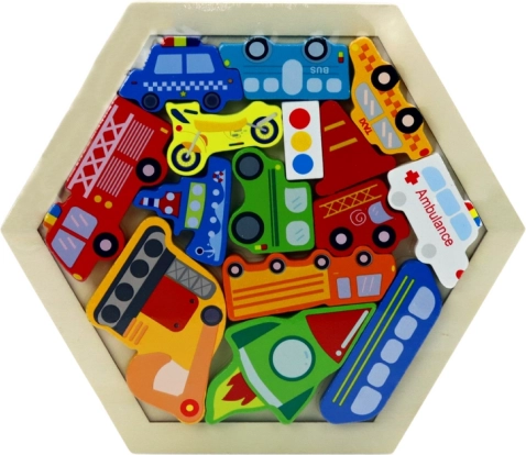 The rocket puzzle is not only a source of fun, but also an effective tool for developing children’s cognitive abilities. The task is for the child to place all the vehicle pieces on the hexagonal base in the correct order so that no empty gaps remain. Each piece has a unique shape, which supports children’s focus and experimentation.