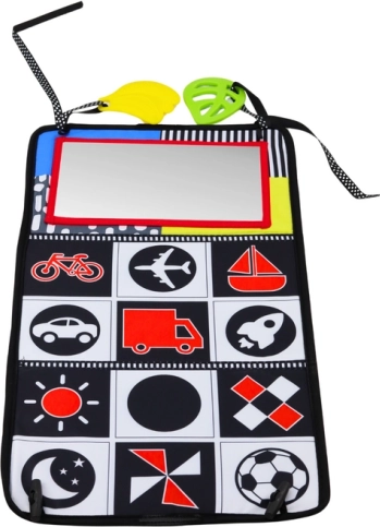 The mirror allows exploration of self-image and the crinkly book provides additional sensory stimulation.