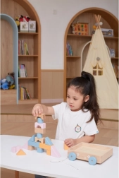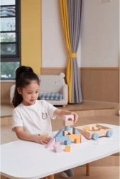 The blocks are made of beech wood, painted in harmonious colors, and secured for children. After playtime, the blocks can be stored back in the cart, making it easy to organize. Thanks to the string, a child can pull the cart with the blocks along the floor, which is not only fun but also practical.