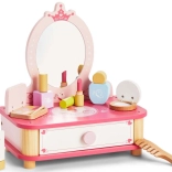 The set includes wooden accessories like lipsticks, perfumes, and eye shadows for creating endless play scenarios.
