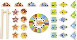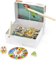 A fun and educational wooden magnetic fishing game from VIGA that includes 26 magnetic fish with letters, 2 rods, and a spinner to choose your catch. It develops hand–eye coordination, color and shape recognition, and offers lots of fun with non-toxic paints from 18 months.