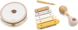 The set includes a tambourine, a xylophone with a mallet, and maracas – all in a compact size for children’s hands.
