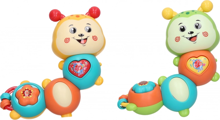 Attractive rattle in the shape of a caterpillar, 14 cm long, brings light and sound effects including melodies that will captivate any child.