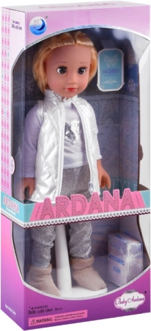 Meet Adrianna – a stylish beauty who will brighten every kids’ kingdom. She has long, silky blonde hair perfect for brushing, striking eyes with curled lashes, and a modern outfit: a pearlescent quilted vest, sparkly leggings, a white top with a silver heart, and soft booties. Thanks to her poseable limbs, she looks great on the included stand.