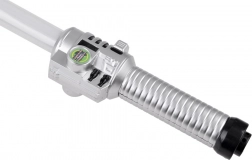An ergonomic silver handle with a button to activate light and sound ensures a secure grip and intuitive use.