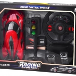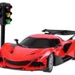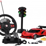 Experience realistic racing with an RC sports car featuring a steering wheel + pedals set and a traffic light. Thanks to intuitive controls you have full control over forward/reverse driving and turning; the car features light effects, rubber tires for better grip, and is powered by a rechargeable battery.