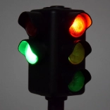 The set also includes a traffic light that enriches play with road elements and helps children learn the basics of traffic rules. The car is made of durable plastic, features rear-wheel drive, and has adjustable front-wheel toe for a more stable ride.
