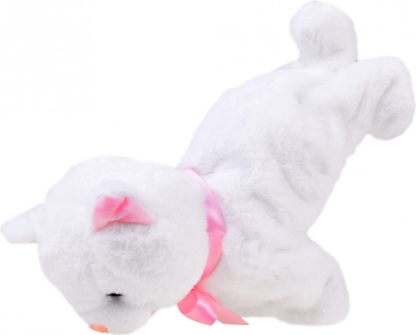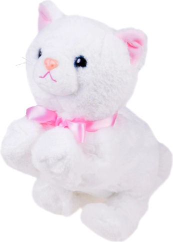 A cute and interactive plush kitten will become every child's best friend. After a touch of the paws or a clap, it makes cat sounds and performs acrobatic moves. Its soft white fur, pink bow, pink nose, and adorable eyes guarantee lots of cuddles and fun.