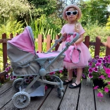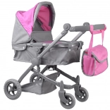 A stylish doll stroller that converts between pram and pushchair modes for realistic caregiving play. It features a lightweight frame, swivel wheels, an adjustable handle, and safety belts. A practical accessories bag is included.