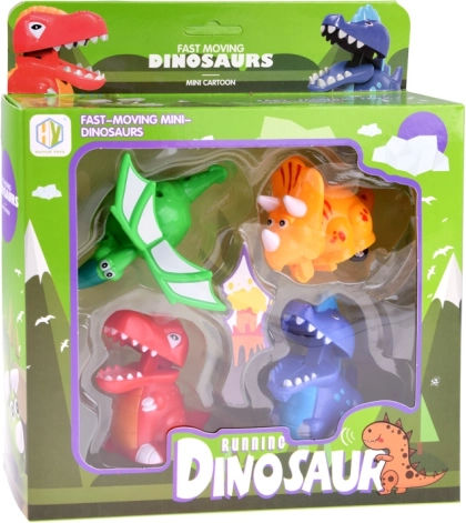 In the box you’ll find a red T-Rex, a green pterodactyl, an orange triceratops, and a blue spinosaurus—perfect for races and themed role play.