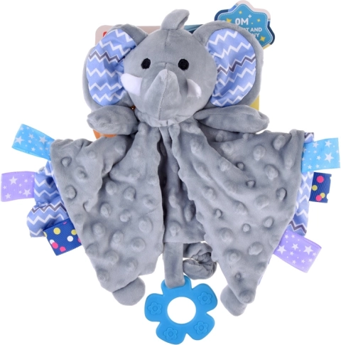This adorable plush comforter in the shape of an elephant offers gentle cuddles, a silicone teether to relieve teething discomfort, and varied textures with tags for tactile exploration. Lightweight, safe, and ideal for the crib, stroller, and car seat.