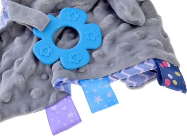 This super-soft comforter combines a cuddly blankie, a fun toy, and a practical teether in one. The varied material textures and colorful tags encourage touching, squeezing, and exploring, while gentle squeaker and crinkle elements support auditory perception.