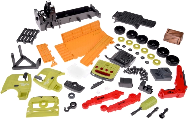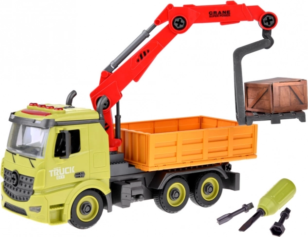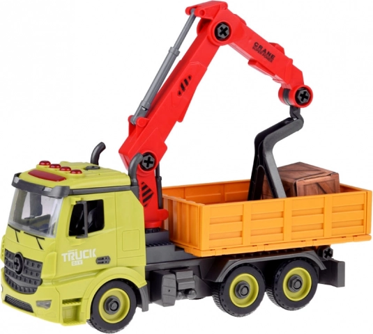 The construction truck with a crane is a perfect choice for young construction-machine enthusiasts, providing hours of great fun. The truck is made of plastic and features bright colors, a sturdy rotating crane arm, and an opening side on the trailer.