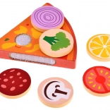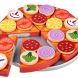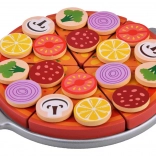 This wooden pizza set offers children the opportunity to become the head chef in their own pizzeria. With 27 wooden pieces, including various colorful accessories, children can create and serve pizza according to their imagination. The pizza pieces are connected with Velcro, allowing for easy cutting and reassembly.