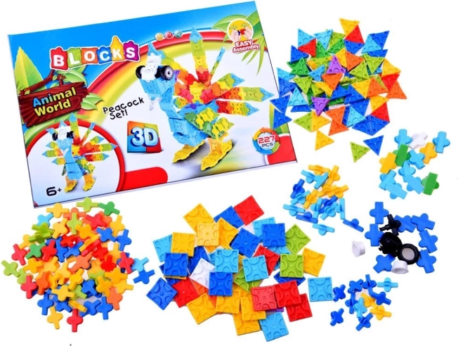Discover a fun and educational building set with 227 pieces that lets kids create 3D models, including a beautiful peacock. Colorful plastic pieces in various shapes easily snap together, developing fine motor skills, creativity, and the perception of colors and shapes. An illustrated guide is included for a quick start.