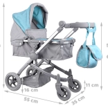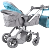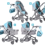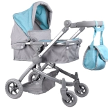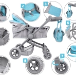 A stylish and stable 4-in-1 doll stroller that easily switches from a deep carrycot to a sport stroller. It offers an adjustable handle (to fit different child heights), a folding canopy, seat belts, swivel front wheels for easy steering, and a spacious basket plus a detachable accessory bag. The lightweight frame ensures easy handling and a realistic play experience.