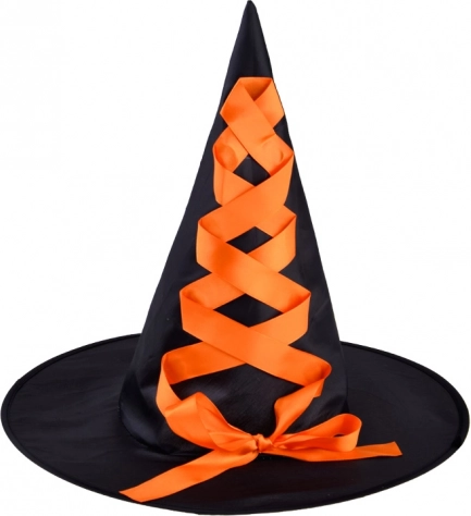 A classic black witch hat with an orange satin ribbon gives the costume an authentic look and holds its shape well.