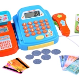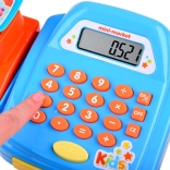 A colorful kids’ cash register with a real calculator, LCD display, sound scanner, and scale offers a realistic store play experience. Includes banknotes, coins, and payment cards for fun counting practice and imaginative play.