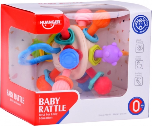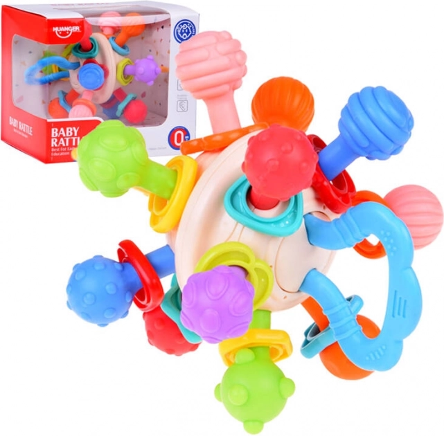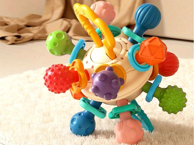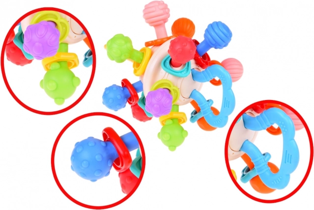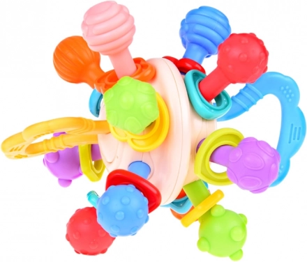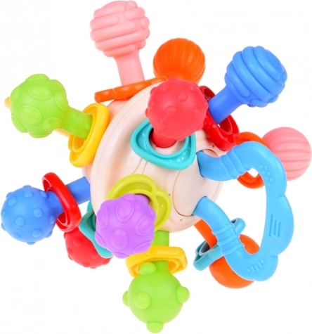 The baby teether helps stimulate the child's senses through a variety of textures and protrusions, encouraging exploration and discovering new tactile sensations. The round shape and soft material of the teether provide relief during tooth growth, alleviating discomfort and gum pain. The child can easily grip and handle the teether, which helps develop fine motor skills and hand-eye coordination. The teether is made of safe materials for babies, free from BPA and other harmful substances, making it a safe and reliable product. Along with parents, the teether can also be a great interactive toy, supporting emotional bonding and the development of the child's communication skills.