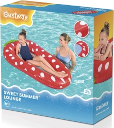 The inflatable mattress with a strawberry motif combines fun and practical features for perfect summer water fun. The vivid red design with white dots and green leaves is captivating, adding a sense of adventure in the fruity world.